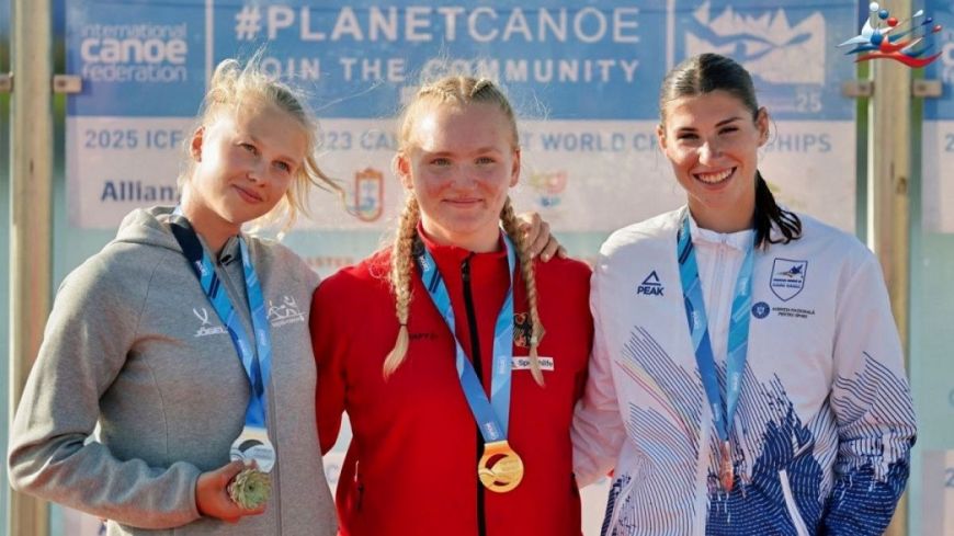 Медалистки первенства мира-2025 на дистанции 1000 метров: Анастасия Кравченко (слева), Нели Рейнвард (Германия) и Бьянка Истратеску (Румыния). Фото: Федерация каноэ России